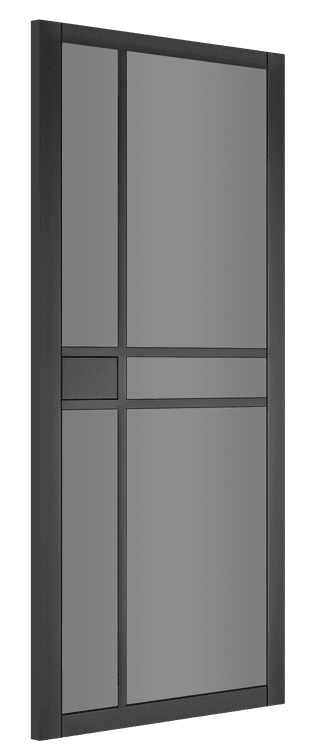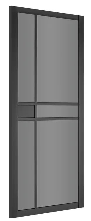 The Deanta Dalston Pre-Finished Black 5 Light Tinted Glazed Internal Door is a smart, modern and minimalist interior door with black tinted glazing to create a dramatic effect in your home or office. Supplied fully finished and ready to install, the Dalston consists of simple, straight lines with an urban industrial look and a tinted glass panel design to add style while reducing visibility and glare.
