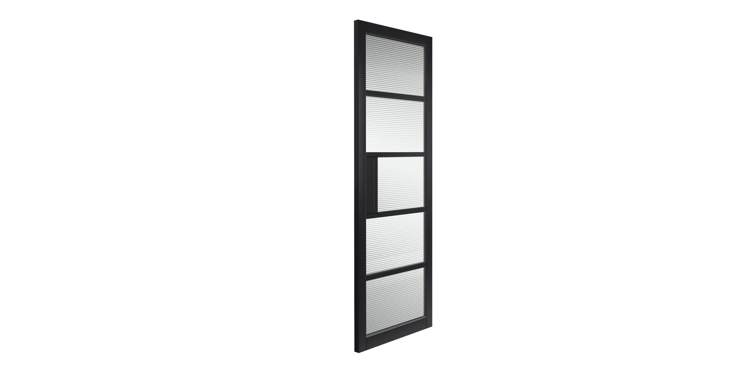 Contemporary industrial style black interior door with reeded glass panels.