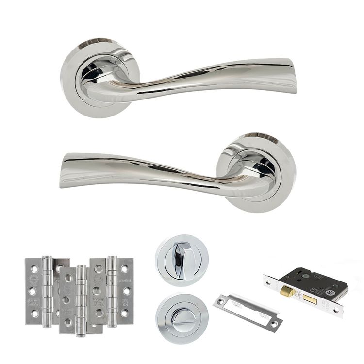 Designed for toilet or bathroom doors, it includes a pair of handles, bathroom lock, turn & release and hinges.