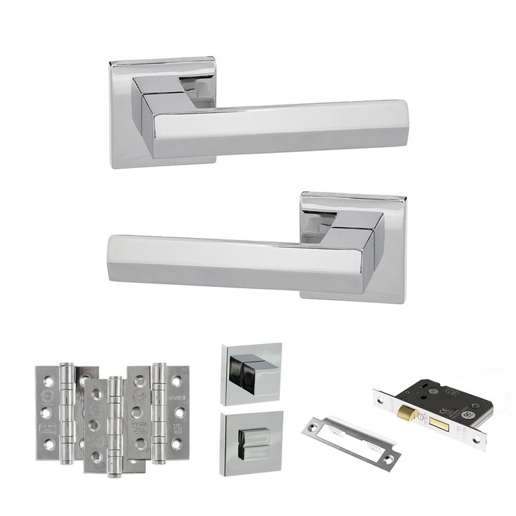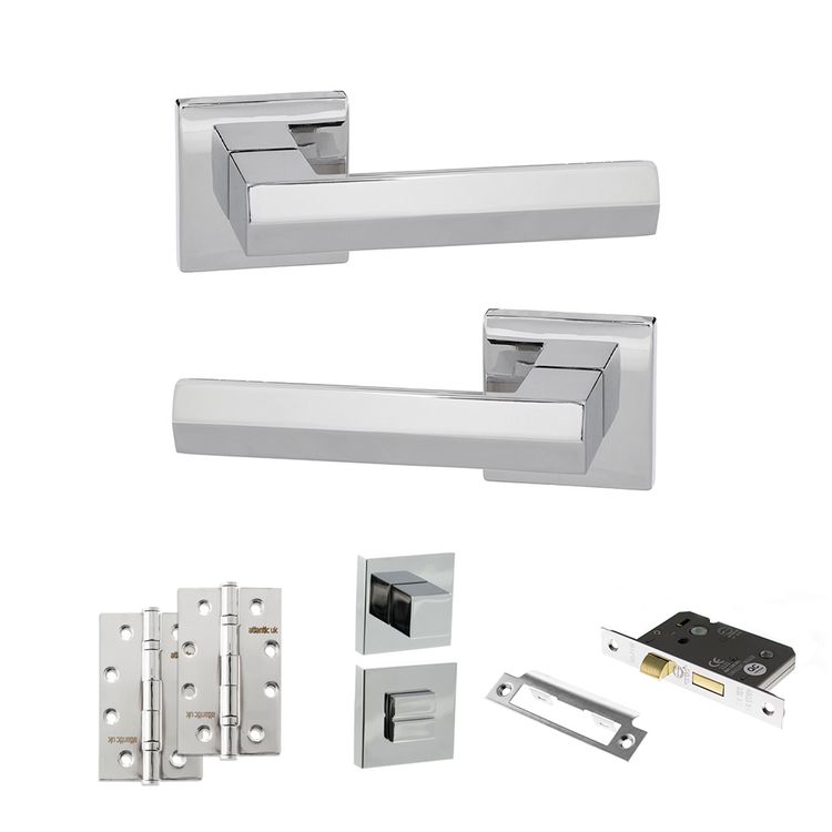 For use on a toilet or bathroom door, this pack comes with a pair of handles, bathroom lock, turn & release and hinges. A modern, sophisticated design with a bold square rose. With a sleek, modern feel and a high-gloss, mirror-like surface, the bright reflective quality of Polished Chrome creates a contemporary look. Senza Pari, meaning 'without equal', is an Italian designed range of contemporary levers. Crafted to make a bold statement, the collection features modern and eye-catching designs. Supplied with matching wood screws.10 year mechanical guarantee subject to Atlantic UK Terms & Conditions.