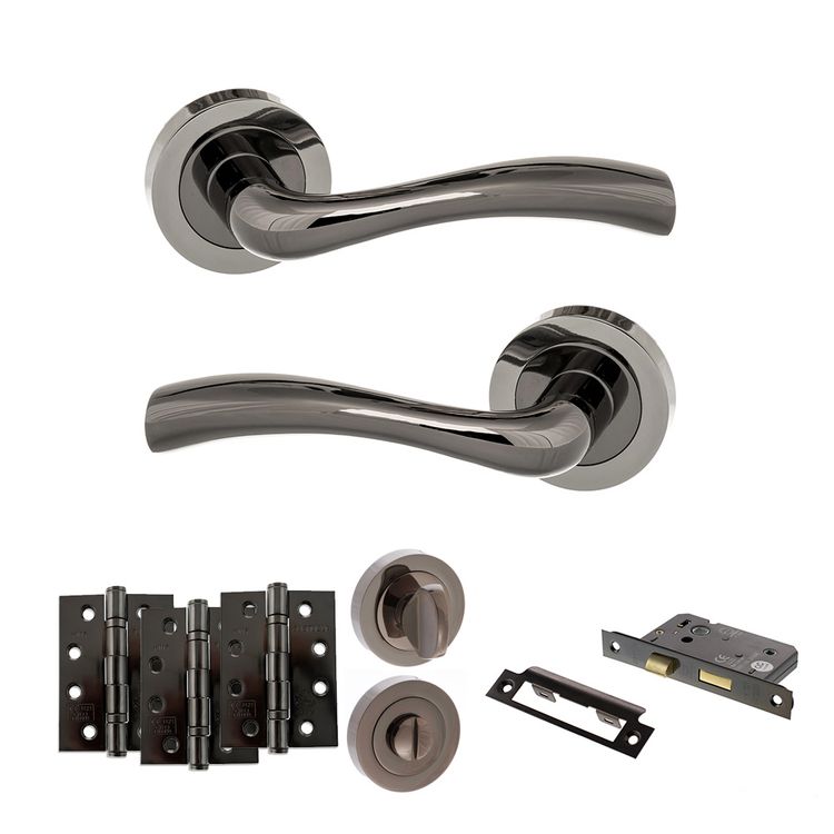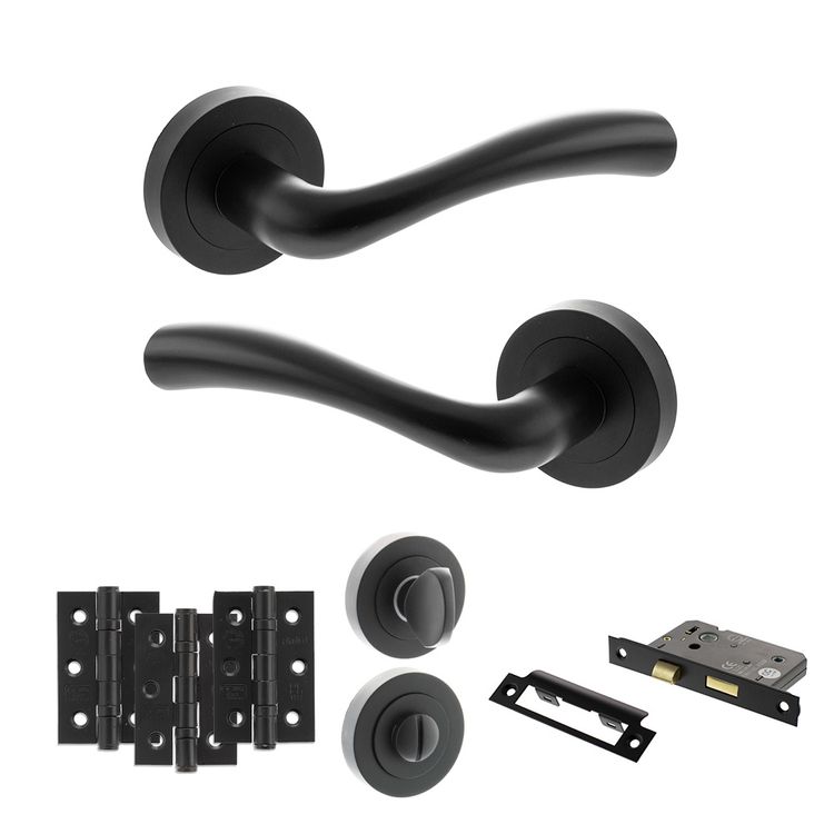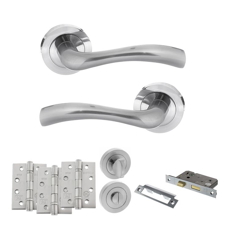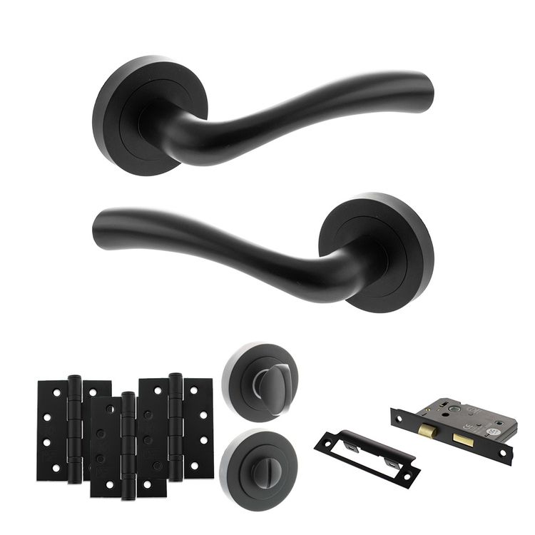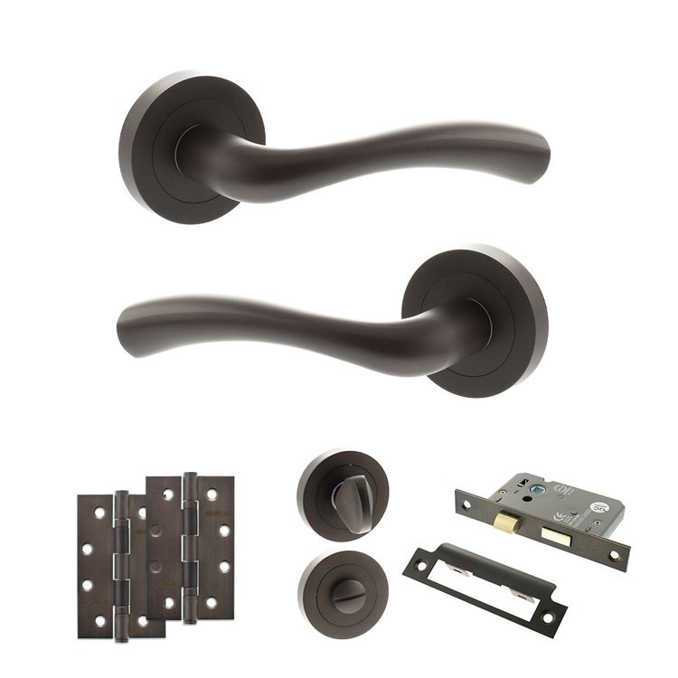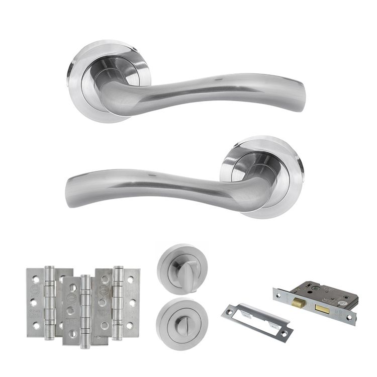 For use on a toilet or bathroom door, this pack comes with a pair of handles, bathroom lock, turn & release and hinges.