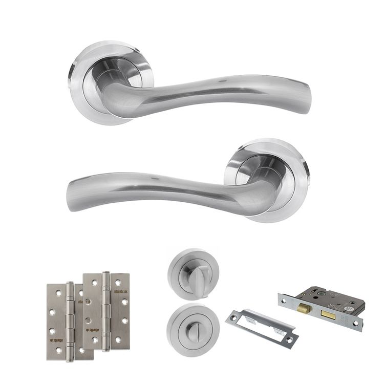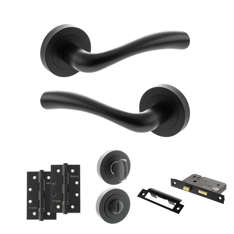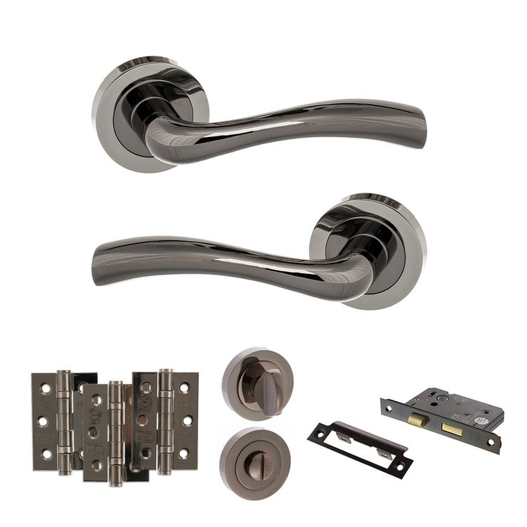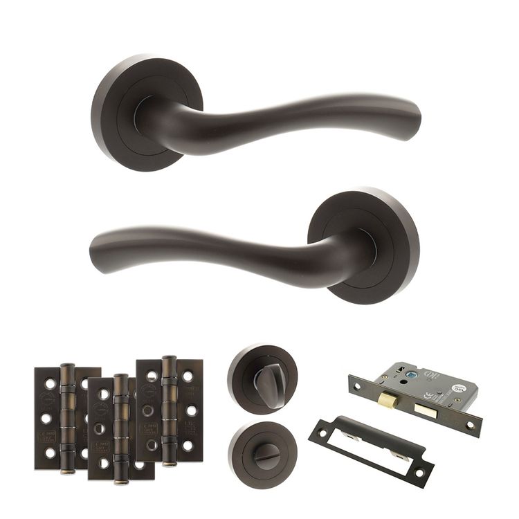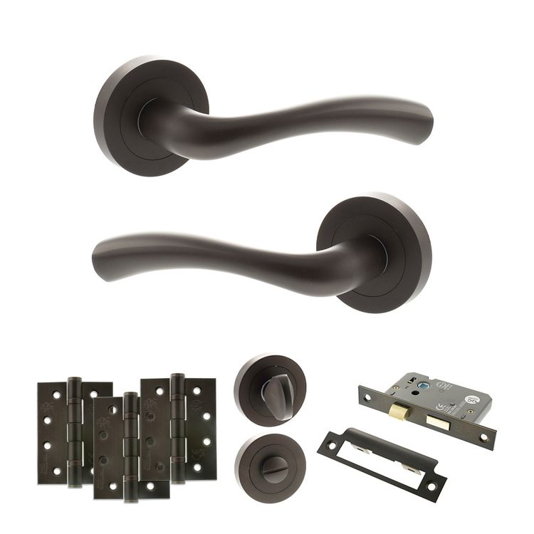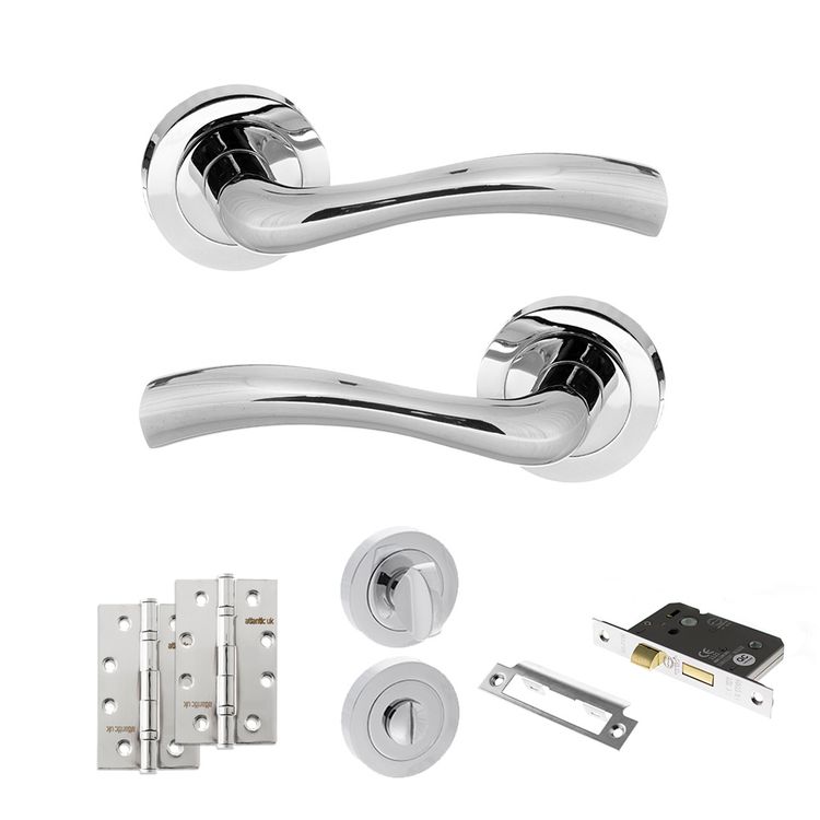 For use on a toilet or bathroom door, this pack comes with a pair of handles, bathroom lock, turn & release and hinges.