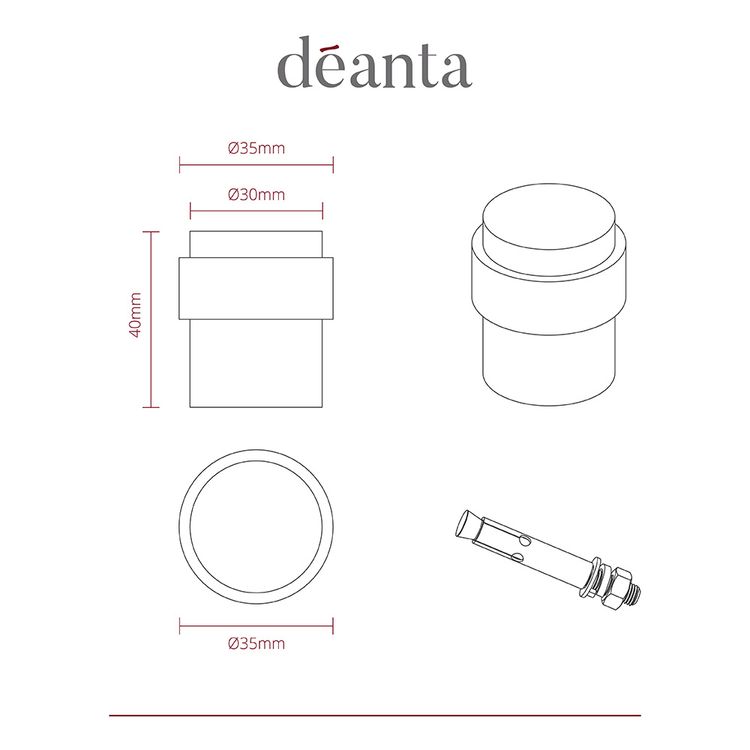 Floor mountedDiameter 30mmHeight 40mmFixings includedIndividually baggedStainless steel constructionCylinder Door Stop (1), Floor Bolt (1), Rubber ring buffer (protects the paintwork on your doors from scuffs)