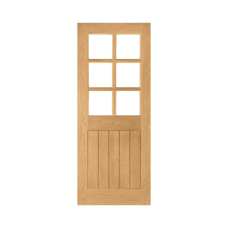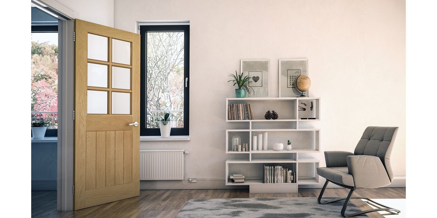 The Deanta Ely Pre-Finished Panelled Oak 6 Light Glazed Internal Door is a stylish, versatile, modern-meets-traditional interior door to complement any kitchen, living room or dining room space. The most popular Deanta style in the UK, this veneered internal door consists of six square panes of toughened bevelled glass, and below, slim and smart, grooved 5-panel detail.