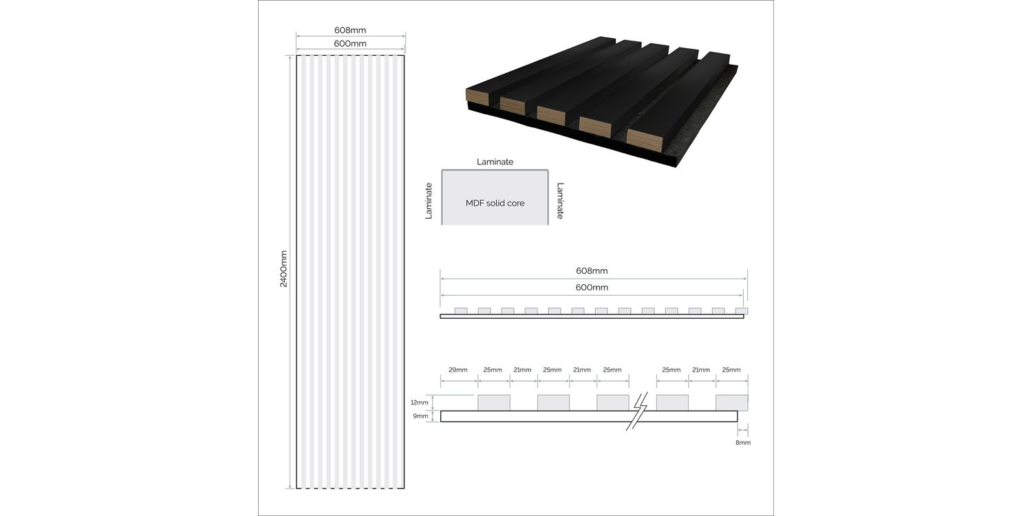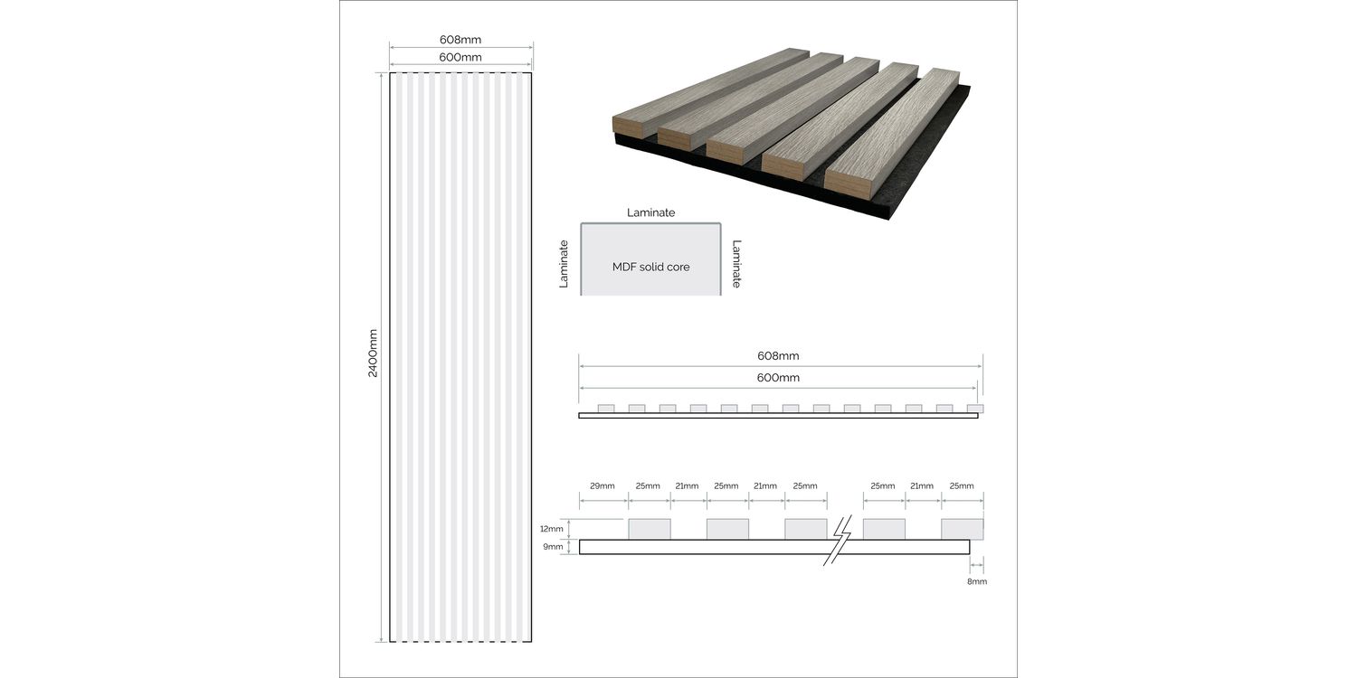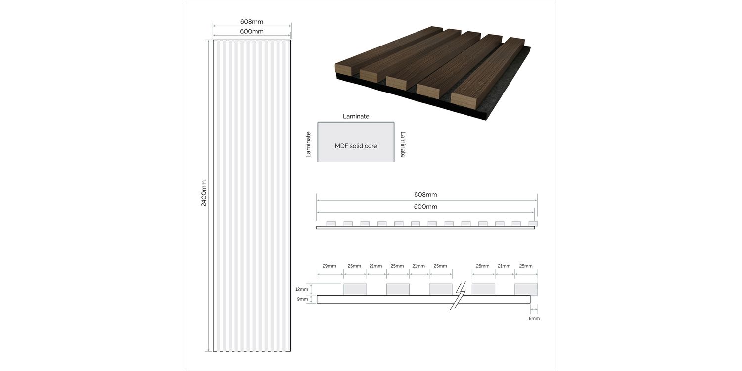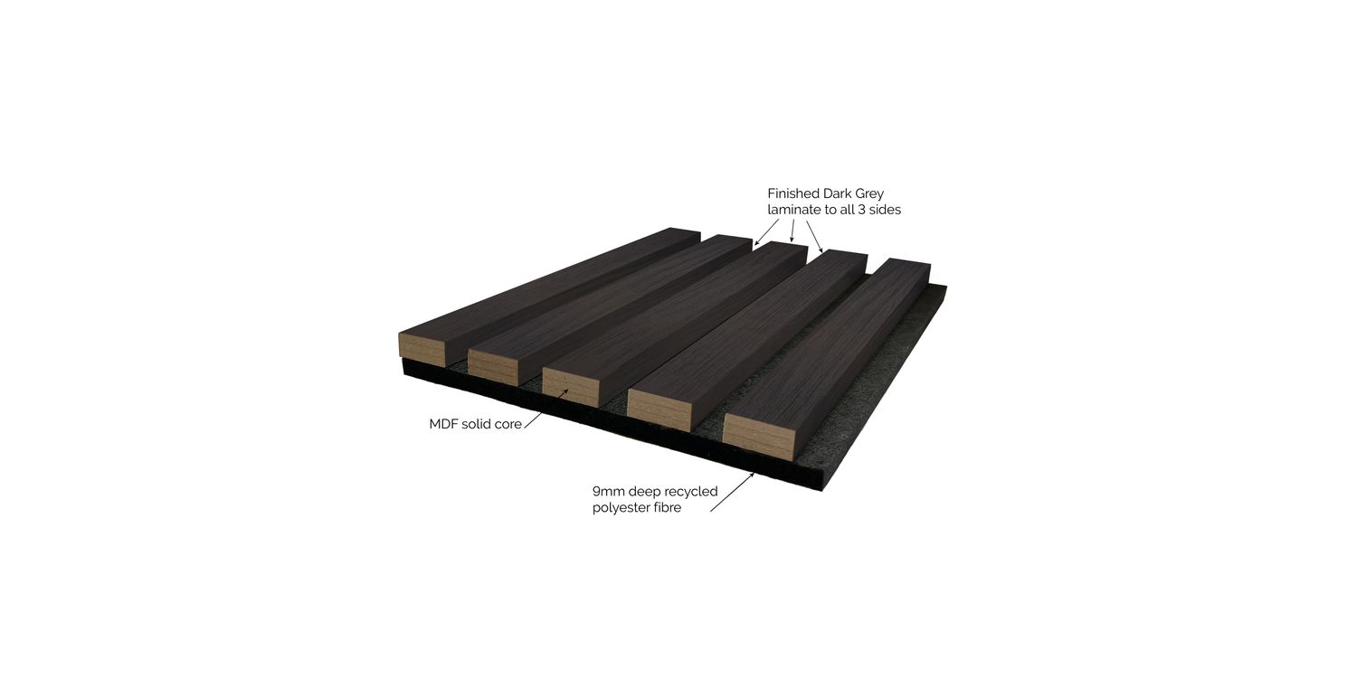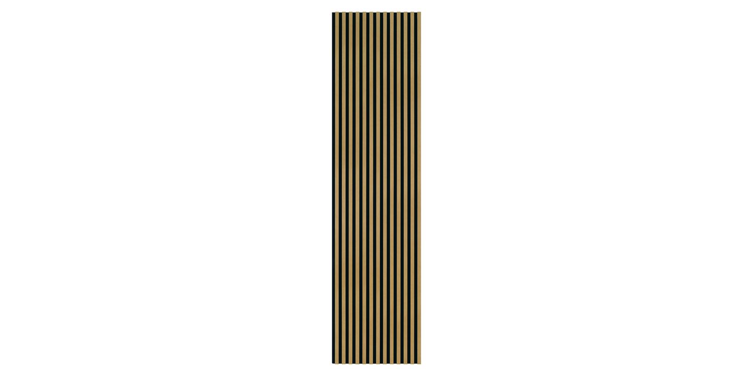 Available in Black, Dark Grey, Light Grey, Oak and Walnut. JB Kind Premium Acoustic Slatted Wall Panels are a wall panelling solution that provide style and sound control in home and office environments. Each panel measures 2400mm x 600mm x 21mm, making them ideal for full-height wall installations or modular layouts.