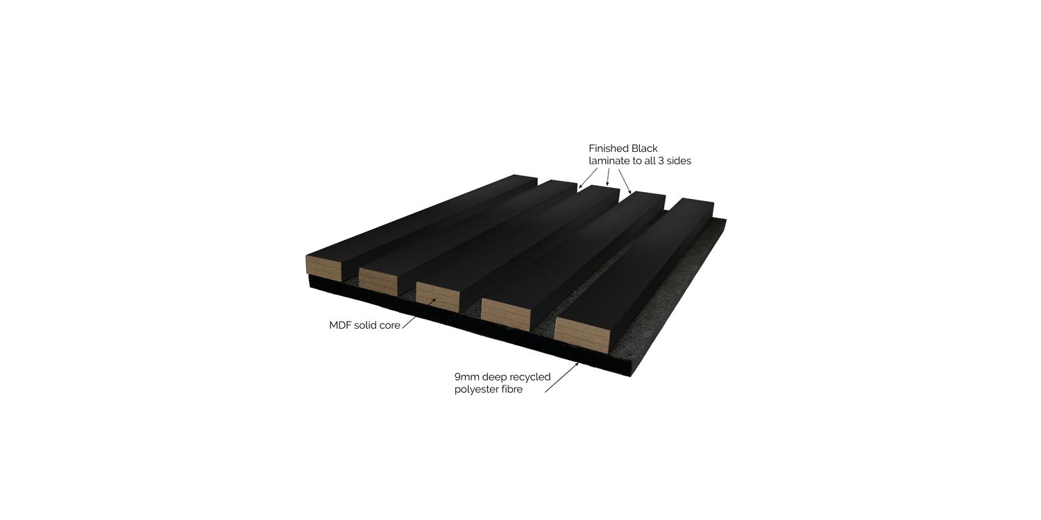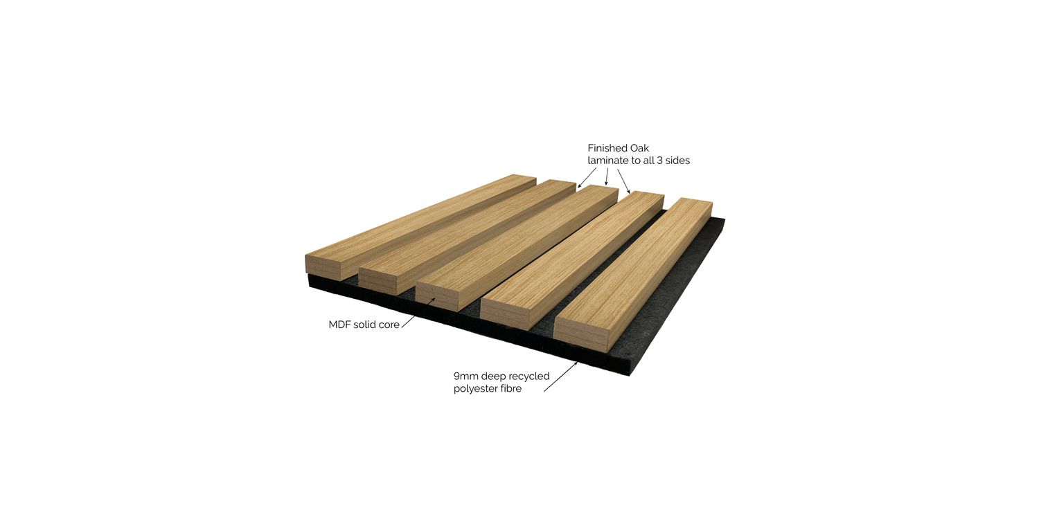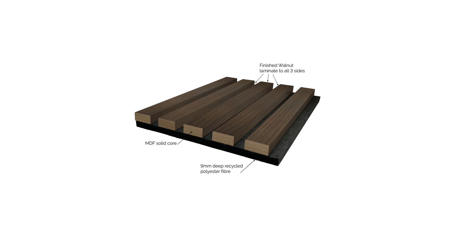 The slats are laminated on all three exposed faces and built around a solid MDF core, both glued and stapled to the backing for exceptional stability and long-term strength. The backing itself is fire-retardant (EU B1 rated) and made from recycled materials, reinforcing JB Kind’s commitment to safety and sustainability.