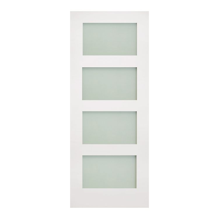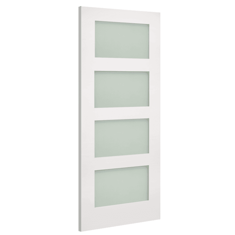 The obscure glazed door features four evenly sized panels of laminated frosted glass within a simple surround.